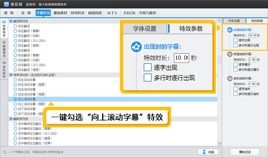 勾选“向上滚动字幕”特效,并设置特效时长,一般建议设置为10秒左右,但具体时长可根据视频长度和字幕内容灵活调整。