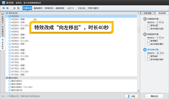 接下来,在特效设置板块中,把“出现特效”以及“停留特效”的勾选状态予以取消。仅在“消失特效”的众多选项里,勾选“向右移出”这一特定效果,并将该特效的持续时长精确调整为50秒,从而使字幕在消失时呈现出特定的动态效果,增强画面的表现力与节奏感。