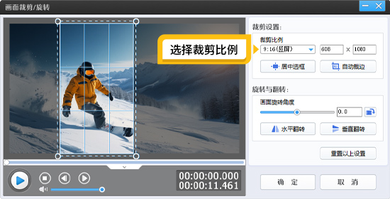 自由调整裁剪框:通过拖动裁剪框的边缘,可以自由调整裁剪范围,精准选择需要的画面内容。这一功能特别适合去除画面中多余的元素(如乱入的人物、水印或字幕)。