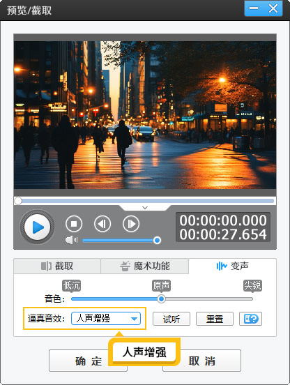 当视频中背景音(如音乐声)过大,导致人物的人声听不清楚时,爱剪辑也有相应的解决办法。同样在“变声”栏目中,选择“人声增强”选项,软件会智能调整音频参数,突出人声部分,抑制背景音的干扰,使得视频中的人声更加清晰、突出,让观众能够轻松听清人物的对话内容。