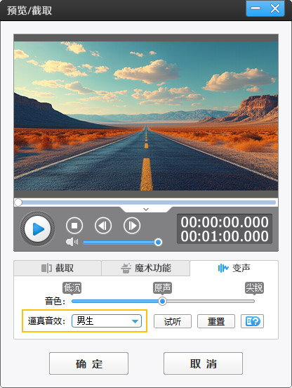 除了基本的音色滑块调整外,爱剪辑还提供了更为专业的音效场景选择功能。在同一个"变声/逼真音效"对话框中,您会看到一个"逼真音效"下拉框。点击这个下拉框,从列表中选择"男生"分类,软件会自动应用一组经过优化的音频参数,这些参数专门为模拟年轻男性声音而设计。